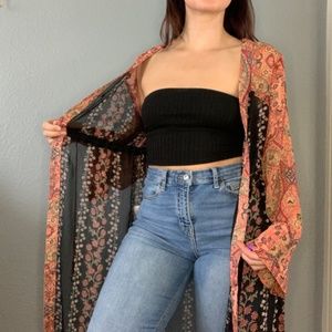 This is a beautiful, light weight duster. It has a vibrant pattern and is very flowy. It has a tie at the waist to create a sexy silhouette! Still has tags