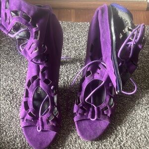 These vibrant purple heels feature a bold color and a soft suede-like texture. The open strappy design includes multiple cutouts, making them a stylish choice for any occasion. With matching purple laces, these heels combine comfort and fashion effortlessly.