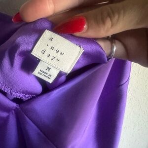 Turn heads in this sleek and elegant satin slip dress from A New Day. Designed in a stunning violet hue, it features a flattering v-neckline, adjustable spaghetti straps, and a bias-cut silhouette that drapes beautifully over the body. The side slit adds a touch of sophistication and ease of movement, perfect for dressing up with heels or keeping it casual with flats or a denim jacket. A timeless piece that transitions effortlessly from day to night