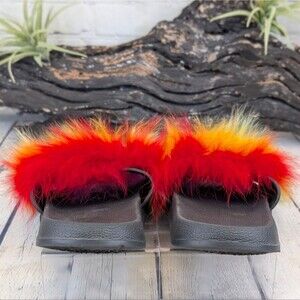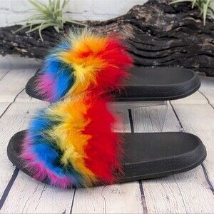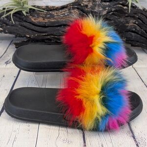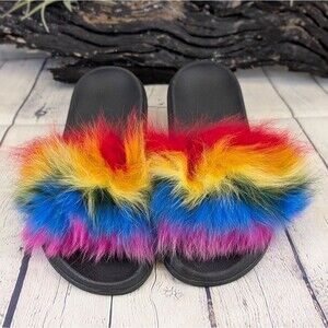 Add a splash of color and comfort to your footwear collection with these vibrant rainbow fur slides. Featuring a plush, multi-colored faux fur strap, these slides are perfect for adding a pop of fun to any outfit. The cushioned black sole ensures both comfort and durability, making them ideal for lounging at home or making a bold fashion statement on the go. Effortlessly combine style and coziness with these must-have rainbow fur slides.