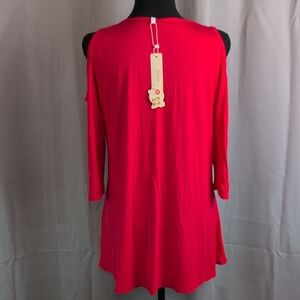 This vibrant red tunic features a stylish cut-out design and 3/4 sleeves, making it a chic addition to any wardrobe. Crafted from a soft fabric, it offers a comfortable fit perfect for casual outings or layering. Its bold color ensures you stand out effortlessly.