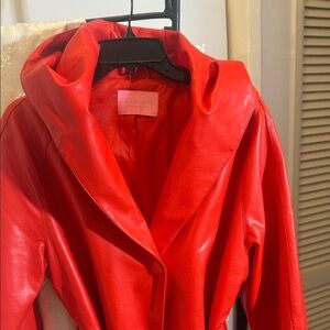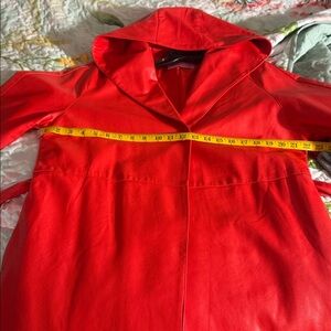 Stylish red faux leather trench coat with an oversized hood and belt. Perfect for a bold fashion statement. P2P is 22 inches.