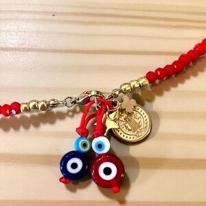 Vibrant Red Hand Beaded Rainbow and Evil Eye Protection Necklace 16” Add a splash of color to your outfit with this vibrant red rainbow and evil eye beaded necklace. Perfect for layering Perfect for all occasions. Size see picture with US quarter.