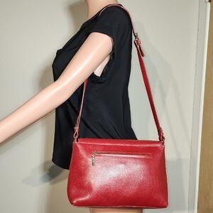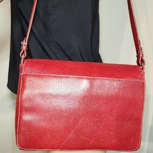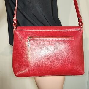 This striking red shoulder bag features a smooth leather finish and a medium-length strap, perfect for everyday use. Its structured shape offers practicality while maintaining a bold, stylish appearance. The vibrant red color ensures it stands out as a statement accessory.