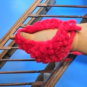 Luxurious brilliant red rabbit fur funky shawl with pom poms. Perfect for adding a pop of color to your holidays. perfect for ant party or celebration. 46" wide, 22" long