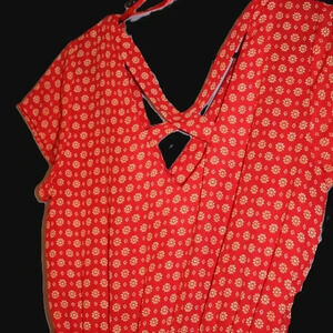 This beautiful romper is so pretty with the vibrant red and floral print. The back is accented by the cross-cross pattern straps, and the shorts are nicely lined so they aren't see through. 100% Polyester.