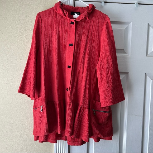 Chic red jacket with a ruffled collar and button-up front. Features zippered pockets and three-quarter sleeves.