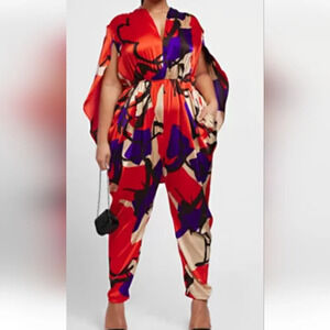 This eye-catching caped jumpsuit showcases a dynamic abstract pattern in red and blue, crafted from a lightweight fabric for a flowing fit. Its relaxed silhouette and wide-leg design make it perfect for making a bold fashion statement.