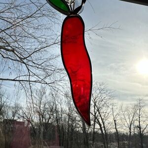 This striking stained glass ornament features a unique chili pepper shape, predominantly in translucent red with a contrasting green top that resembles a stem. Designed to hang in a window, it beautifully captures light, enhancing its vivid colors and elegant form. The piece is outlined with a darker material, adding definition and depth to its design.