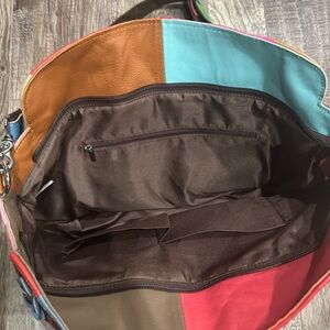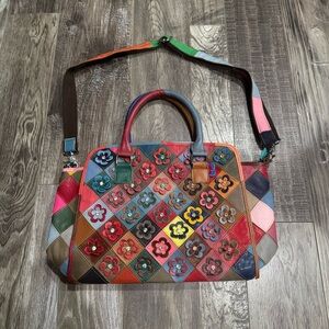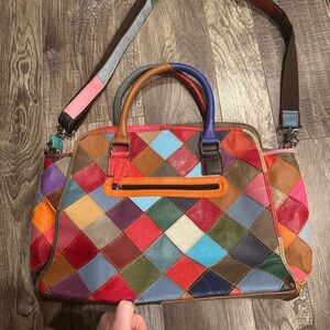 This eye-catching crossbody bag showcases a lively geometric patchwork design in vibrant shades of red and pink. Its structured silhouette and detachable shoulder strap offer both style and versatility. Crafted with a mix of textures, this bag is a standout accessory for any occasion.
