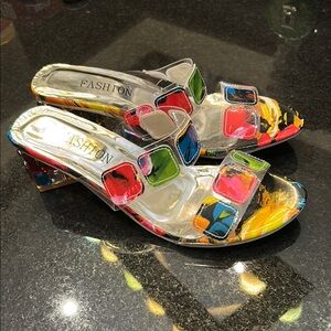 These eye-catching mules showcase a bold red and pink color scheme, perfect for making a statement. Featuring a medium-height chunky heel and an open toe design, they combine style with comfort. Ideal for adding a pop of color to any ensemble, these shoes are a modern must-have. Size on bottom says 42 but I wear a 9 1/2 and they fit me.