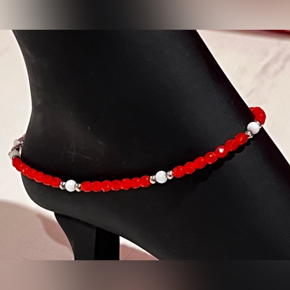 NEW - Chic handmade beaded anklet featuring vibrant red seed beads, white round beads, silver accent beads and a screw clasp for a touch of style. Ideal for a splash of color and compliments any outfit.