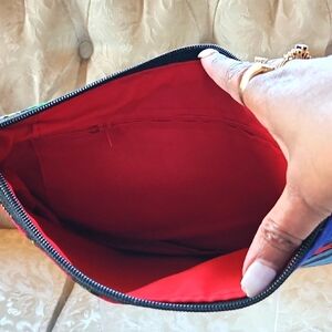 This striking clutch/cosmetic bag features a lively mix of red and yellow African wax print fabrics, creating a bold and artistic accessory. Perfect for organizing your beauty essentials, its compact design adds a splash of color to any collection.