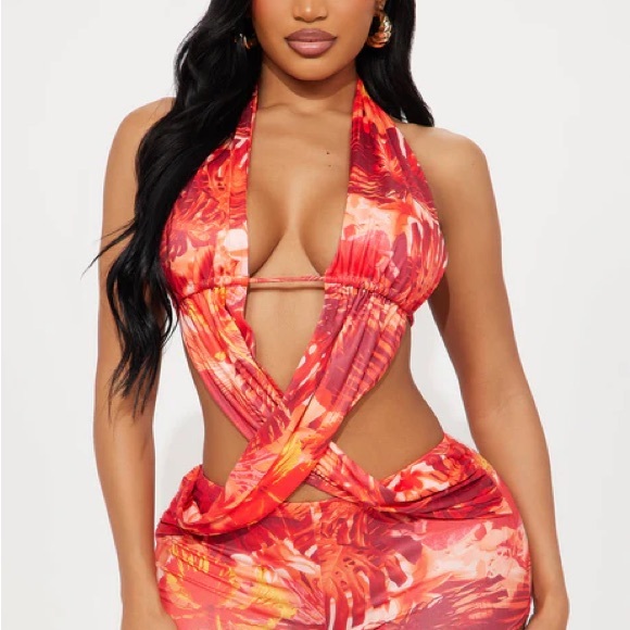 Stunning romper with a vibrant red pattern. Perfect for vacation