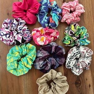 Collection of colorful scrunchies in various patterns. Perfect for adding flair to any hairstyle.