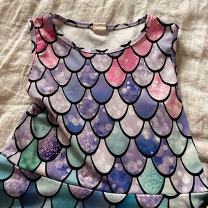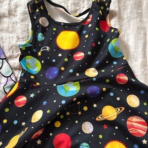 Delight your child with this vibrant dress set featuring a space-themed design and a colorful mermaid scale pattern. Perfect for casual outings and playdates. Perfect for twirling. Fits similar to target size 8-10 girls large. Purchased locally at children’s boutique.