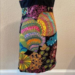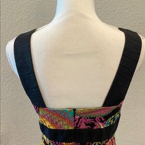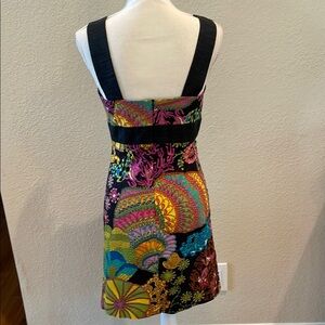 This striking mini dress by Trina Turk features a sleek multi color palette, perfect for a cocktail night out. The sleeveless design with a plunge neckline adds a touch of elegance, while the sheath style ensures a flattering fit. Ideal for making a bold statement, this dress is both chic and sophisticated.