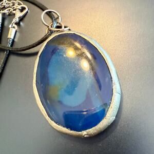 This is a vibrant, unique artisan blue fused glass pendant. Featuring an oval shape, it measures 1.6" in length and comes with a black cord (20").