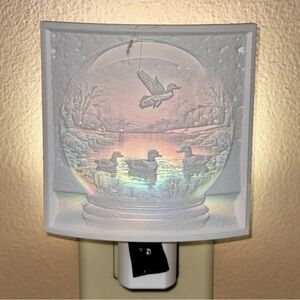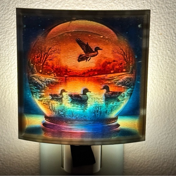 Illuminate your space with this stunning wildlife art night light. Featuring a vivid scene of ducks in a serene setting, this piece adds a touch of nature to your home decor. The vibrant colors create a warm and inviting atmosphere.