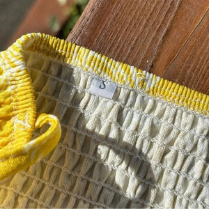 No brand, only tag inside says Small. This dress has a nice weight to it, a fit and flare style, such a fun vibrant yellow with a botanical print and faux button front with smocking in the back. Excellent like new condition!
