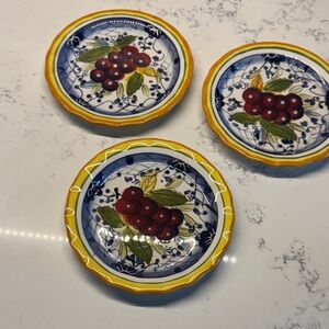 Enhance your dining table with these vibrant ceramic plates featuring a charming fruit design. The bold yellow and blue colors add a lively touch to any meal.