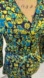 Stylish wrap top with a vibrant yellow and blue pattern. Features a tie waist for a flattering fit.