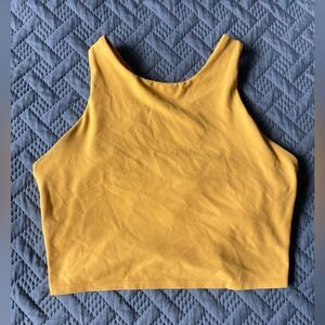 This vibrant yellow crop tank top features a sleeveless design and a stylish cropped hemline, perfect for warm weather. The simple yet chic style makes it a versatile addition to any wardrobe, ideal for casual outings or layering.