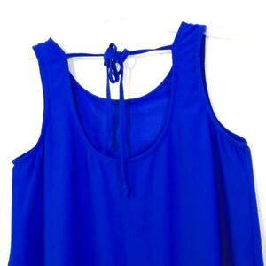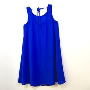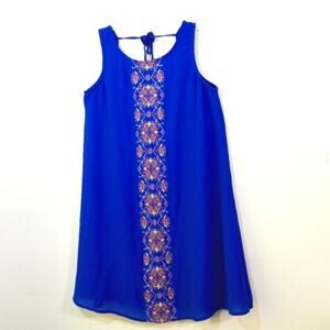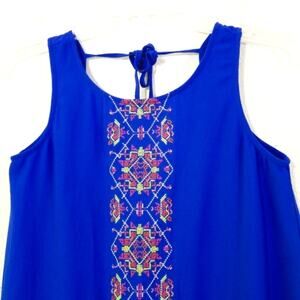 My Michelle vibrant cobalt blue loose fit mini shift dress with aztek style embroidery down the front and scoop back with ties