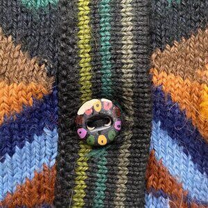 Elevate your wardrobe with this vintage geometric pattern cardigan. Its vibrant multicolor design and unique button closure make it both stylish and eye-catching. Ideal for colder months, it pairs well with various outfits for a chic look.