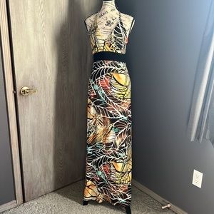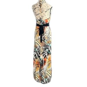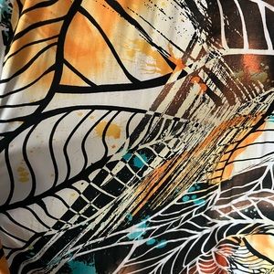 Gorgeous and unique maxi dress in yellows, oranges, black, blue and brown. Too long on me so it never gets worn.