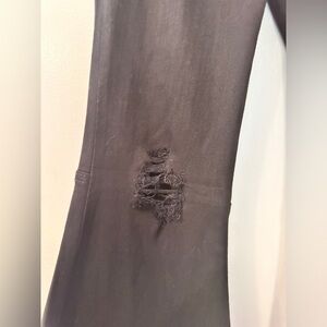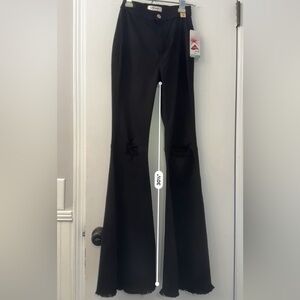 Vibrant M.I.U. Flared Black Stretchy Jeans in Size 25, made primarily of cotton, featuring a slight rip on the knees. They’ll hug you in all the right places. These jeans are brand new with tags attached.