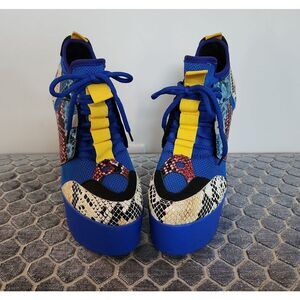 Elevate your look with these striking platform sneakers. Featuring a bold blue and yellow design with unique patterns, these shoes are perfect for making a statement.
