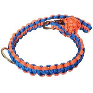 Description: Stylish and durable paracord dog collar in vibrant orange and blue. Perfect for daily walks and adventures. Buckle closure with D ring for leash.