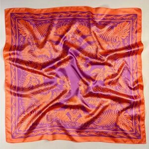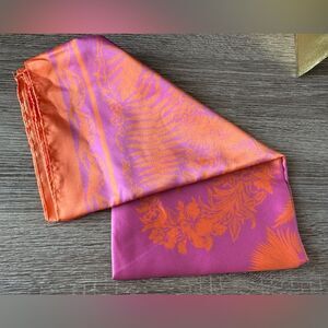 Stylish scarf with a vibrant orange and pink floral design. Perfect for adding a pop of color to any outfit.