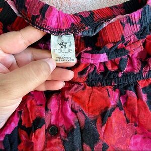 Vibrant Red Floral Tube Top ~ size small ~ brand is Nollie ~ great condition ~ 100% rayon ~ has two button pockets on the bust ~ stretchy elastic to cling to your body then flowy fabric ~ has buttons all the way down on the front ~ romantic red & pink flowers šŗšø