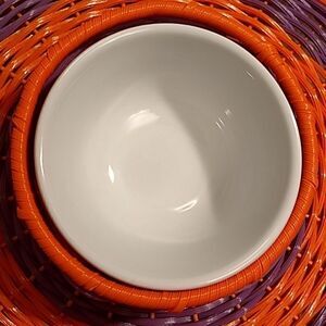 Vibrantly colored, plastic and wire catch-all with small ceramic bowl. Could be used for chips and dip. Very colorful and in excellent condition.