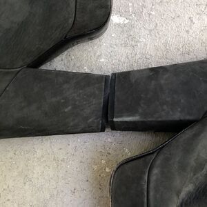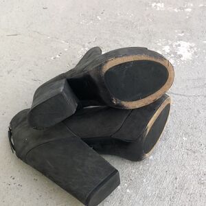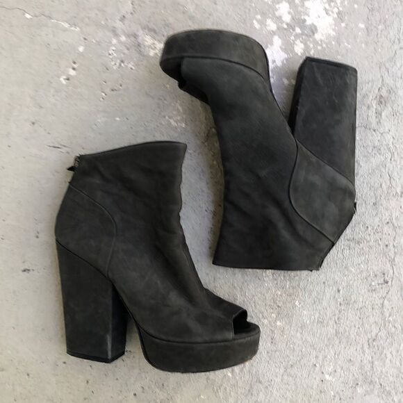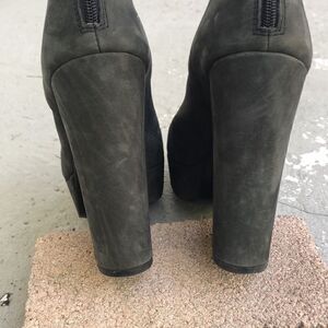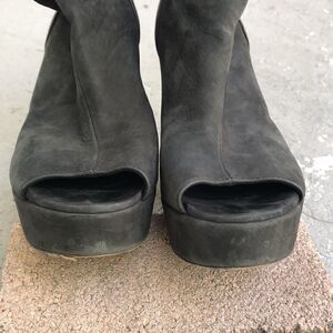 These feel like an ultra suede leather exterior and leather lined. Made in Italy. Super cute and comfortable but not perfect so please check the pictures. Heel height is 5 inches platform. Height is 1.5 inches.