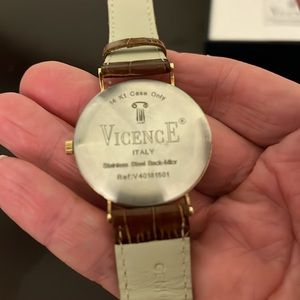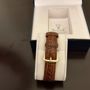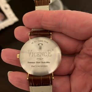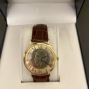 This is a spectacular 100 Lire Coin watch from Italy. The case is 14k gold with stainless steel back. It has a new battery and new brown leather band from Milor Italy. Numbered on the back: V 40181501. Comes with box as shown.
