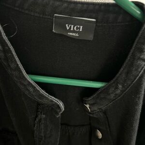 This Vici black jean jacket combines classic style with modern flair, featuring a unique studded shoulder embellishment that adds a touch of edge. Crafted from durable denim, it offers a timeless look perfect for layering in any season.