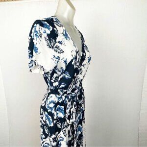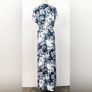 It is a navy blue floral wrap maxi dress, navy and white floral print with flutter short sleeves. The neckline is a drape with plunging v style. It is a true wrap with size slit.