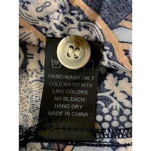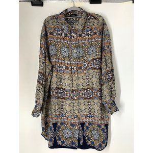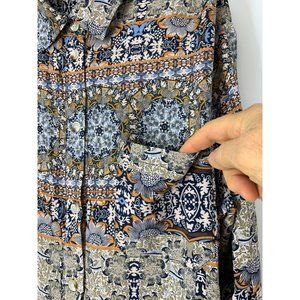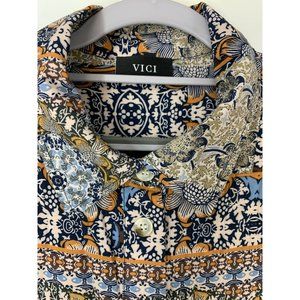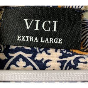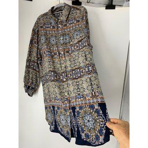 Stylish Vici dress with intricate blue and brown patterns. Loose fit with a casual vibe. Perfect for any occasion.
