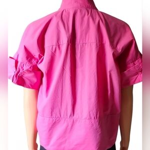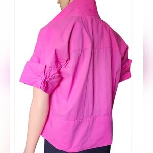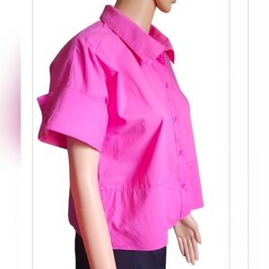Chic and vibrant button-down shirt. Features short sleeves and classic collar. Ideal for casual or dressy looks.