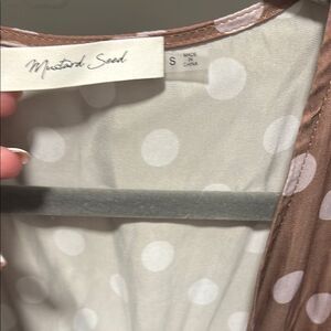 Chic brown wrap dress with white polka dots. Features flutter sleeves and a tie waist. Like pretty woman polka dot dress. Button at the wrap area in the front needs to be fixed but otherwise this is perfect for the Derby! 🐎