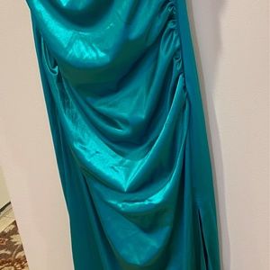 *Cowl neck with ruching on either side, stretchy material, slit on left side and pop of lace on the back of dress as it is a low back