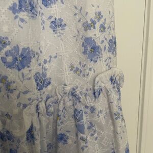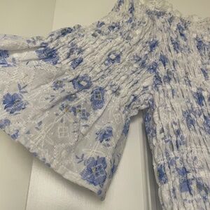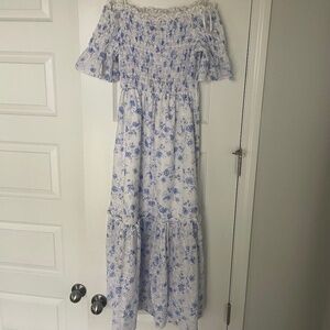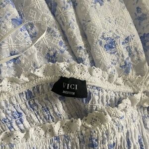 Vici eyelet blue and white midi dress with pockets. Off the shoulder style