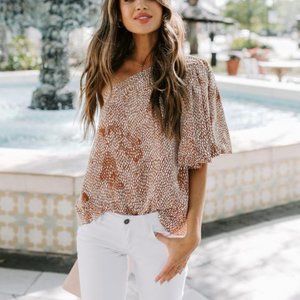 Our Gemstone Printed One Shoulder Puff Sleeve Blouse is adorably chic! White abstract spots grace a camel hued relaxed fit blouse. The one shoulder neckline elevates with a moody puff sleeve for a unique twist! Style yours with white denim to make your look pop! Finished with a full lining. NWOT, Size small, never worn.