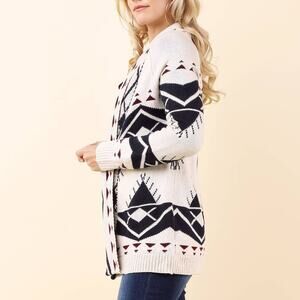 Vici Geo Print Aztec Oversized Open Front Long Cardigan Sweater Taupe Size Small. LIKE NEW! Worn once. Geo Print / Actec / Tribal pattern design allover. Oversized, longline cardigan. Open front. Shawl collar. Long raglan sleeves. Ribbed cuffs and hemline. Knitted construction. Style# VCW0453.