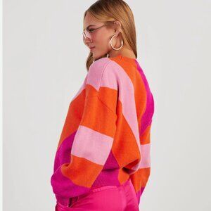 Features a unique cross stripe color block pattern. Designed with long sleeves that continue the color block pattern, a round neck long, regular fit, and cozy knit texture. Pair with denim for a cute and fun look.
