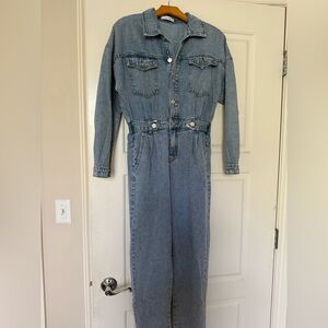 Stylish denim jumpsuit. Features button-up front. Long sleeves with a relaxed fit. Perfect for casual outings. Perfect condition