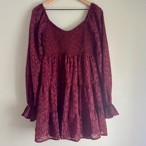 Excellent like new condition burgundy colored dress from Vici with long sleeves and a smocked top and a baby doll fit